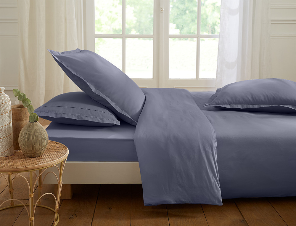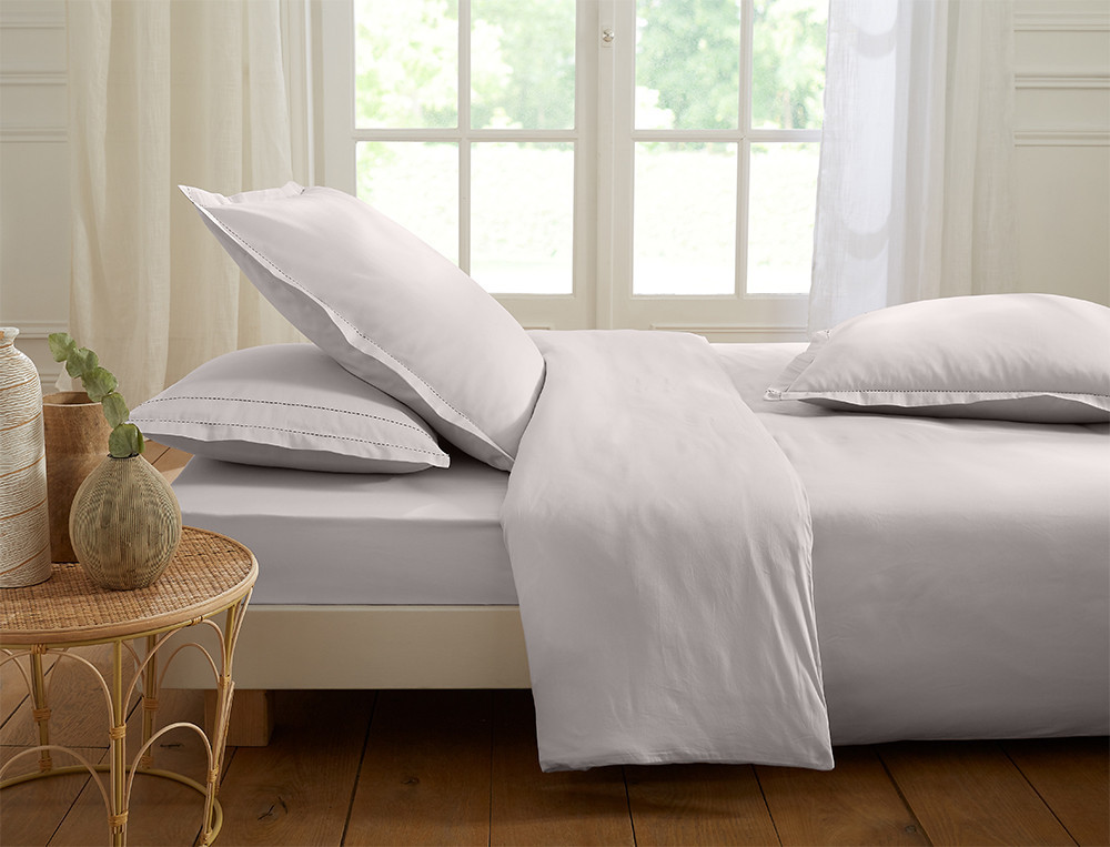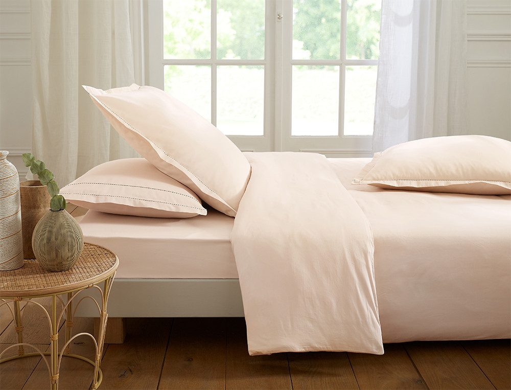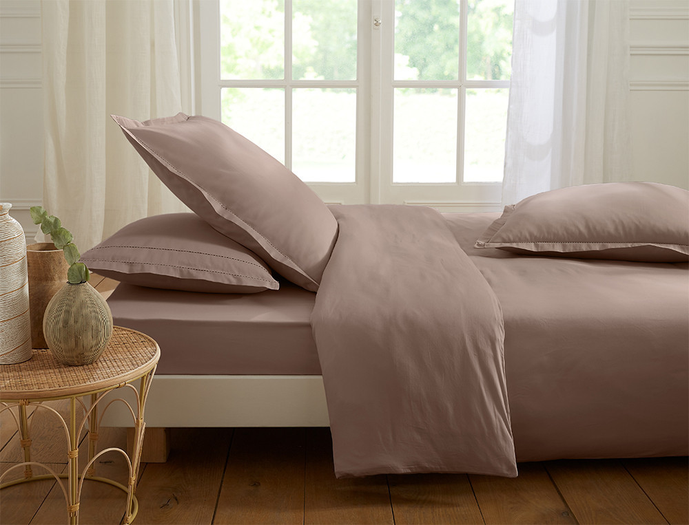 Satin aus 100% gekämmter Baumwolle mit 108 Fäden/cm2. 60°C-Wäsche.