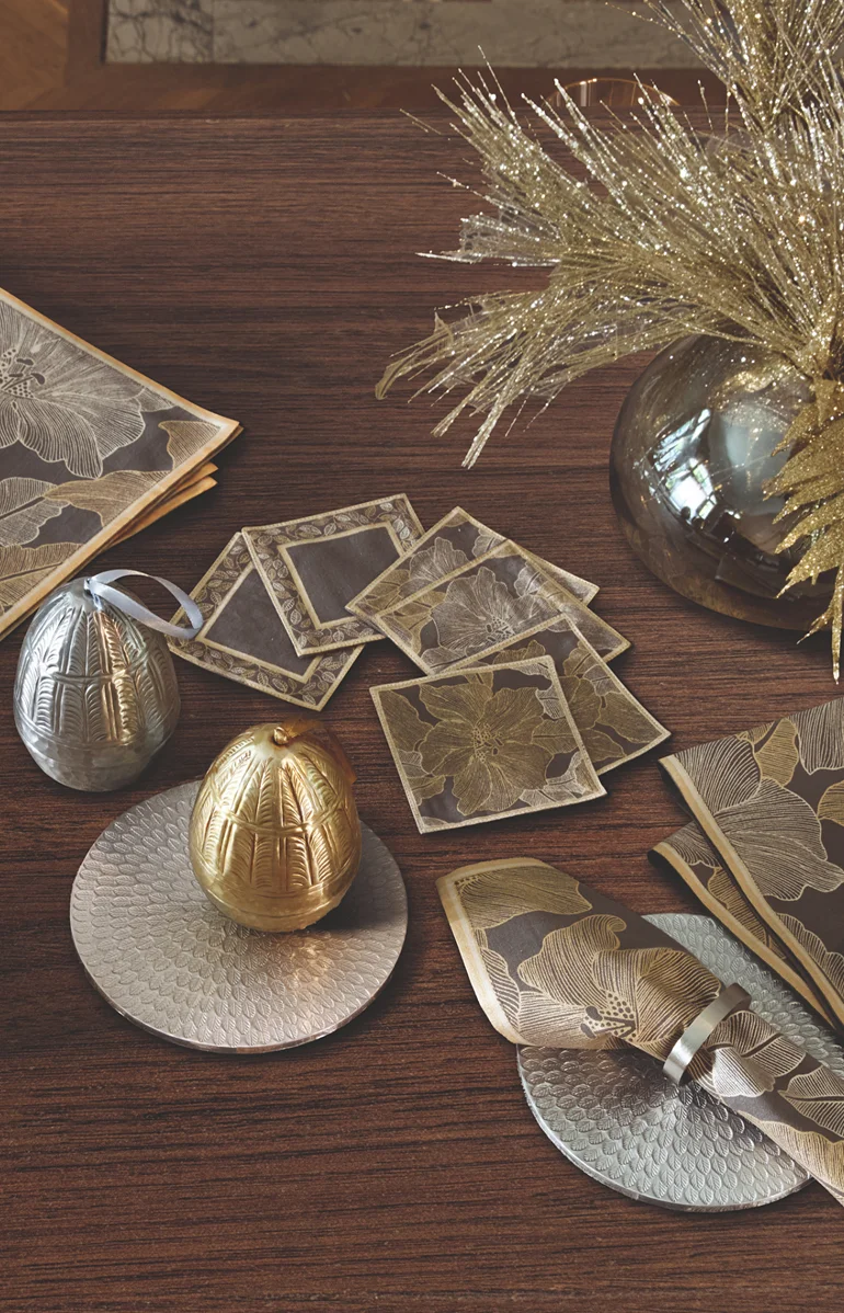 Sous une lumière d’hiver, la table se pare de reflets doux et d’éclats délicats. Les tons givrés jouent